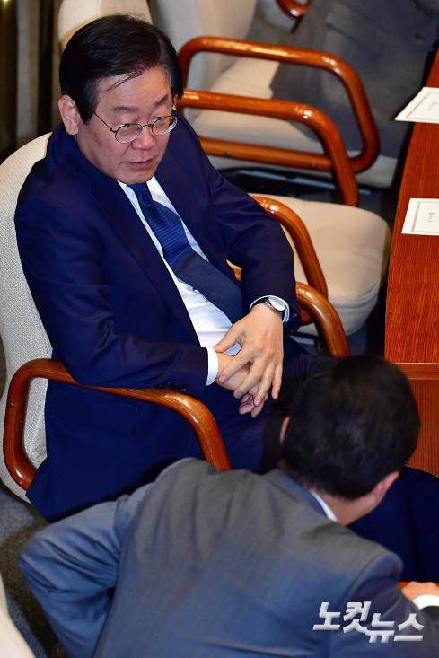 더불어민주당 이재명 대표와 박홍근 원내대표가 13일 서울 여의도 국회에서 열린 본회의에서 대화를 하고 있다.
