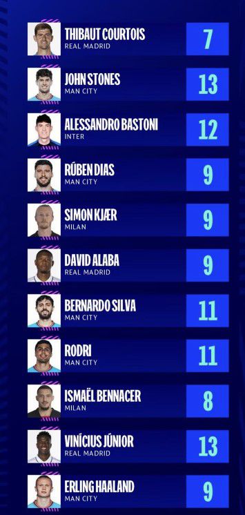 맨시티 선수가 5명이었다. 엘링 홀란드, 로드리, 베르나르두 실바, 후벵 디아스, 존 스톤스가 포함됐다. 홀란드는 올 시즌 공식전 45번째 골을 터트리면서 괴물 본능을 과시했다. 로드리는 환상적인 득점을 터트렸고 실바는 우측에서 종횡무진 움직이며 뮌헨 수비를 괴롭혔다.