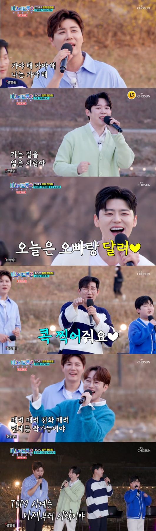 초특급 팬 서비스 '찾아가는 TOP7'이 팬들을 열광시켰다. 조용한 아파트 단지에 깜짝 등장해 팬들에게 눈앞 1열 직관 기회를 선사한 TOP7은 진해성의 '열두줄', 나상도의 '사내', 안성훈의 '천년지기' 등 야외에서도 흔들리지 않는 가창력으로 레전드 무대를 꾸미며 콘서트장을 방불케 하는 열기를 불러일으켰다.