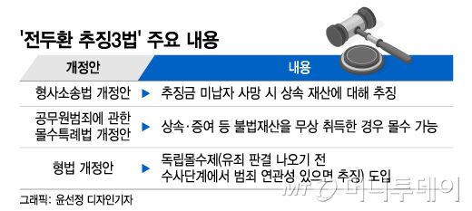 이 법안은 전씨의 미납 추징금을 계기로 현행법의 한계를 보완하기 위한 취지로 마련됐다. 구체적인 내용을 살펴보면 형사소송법 개정안은 추징금을 미납한 사람이 사망하면 상속 재산에 대해 추징한다는 것이 요지다.