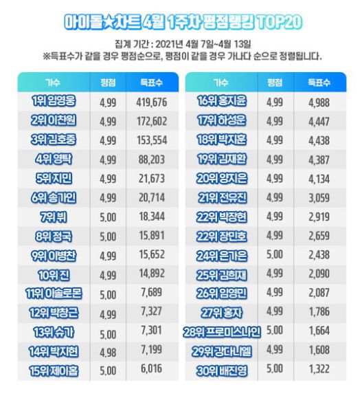 아이돌차트에 따르면 지난 4월 7일부터 4월 13일까지 집계된 평점랭킹에서 임영웅은 41만 9676표를 얻어 최다득표를 기록했다.