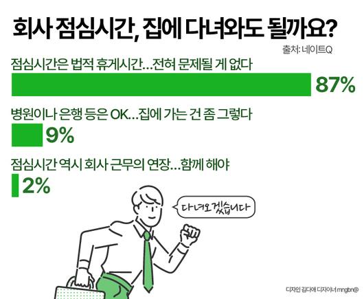 SK커뮤니케이션즈 시사 폴(Poll) 서비스 ‘네이트Q’가 성인남녀 1만1204명을 대상으로 설문조사를 한 결과, 응답자 중 87%(9810명)가 ‘점심시간은 법적 휴게시간으로 집에 가는 게 전혀 문제 될 게 없다’라고 답하며 상사 지적의 부당함을 꼬집었다.
