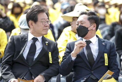 이재명 더불어민주당 대표와 김기현 국민의힘 대표가 16일 경기도 안산 화랑유원지에서 열린 ‘세월호 참사 9주기 기억식’에서 대화를 나누고 있다. [연합뉴스] |