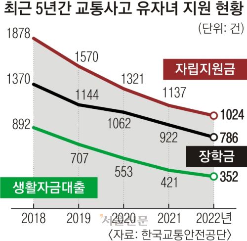 하지만 이러한 지원도 함께 생활하는 가구가 기초생활수급자이거나 차상위계층인 경우에만 해당된다. 여기에 18세 미만(고교 재학 시 20세)까지만 장학금을 지원해 기초생활수급자나 차상위계층 대학생은 이 장학금조차 받을 수 없다. 교통사고 유자녀 지원 제도마저 잘 알려지지 않아 갈수록 지원 대상이 감소세다.