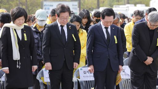여야 대표들을 비롯한 참석자들이 16일 경기 안산시 화랑유원지에서 열린 세월호 참사 9주기 기억식에서 묵념을 하고 있다. 왼쪽부터 정의당 이정미 대표, 더불어민주당 이재명 대표, 국민의힘 김기현 대표. 안산=이재문 기자 ⓒ 세상을 보는 눈, 세계일보