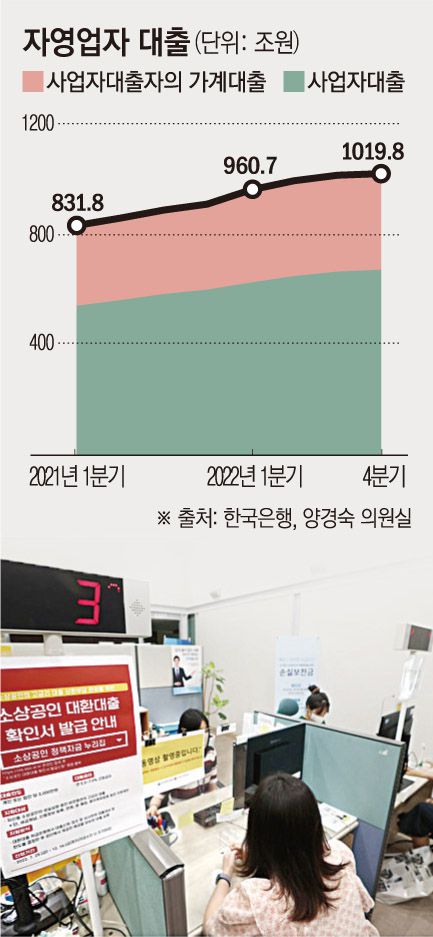 16일 한국은행이 국회 기획재정위원회 소속 양경숙 더불어민주당 의원실에 제출한 자료에 따르면 지난해 4분기 말 기준 자영업자 대출 규모는 1019조8000억 원이다. 자영업자 대출은 지난해 3분기(1014조2000억 원) 처음으로 1000조 원을 돌파한 후 이번에 또 관련 통계 작성 이후 최대 기록을 경신했다.