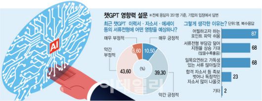 반면 부정적으로 보는 사유로는 ‘서류전형의 변별력이 떨어진다(62.5%)’는 의견이 가장 많았다. 이어 △지원자의 개성·특징을 파악하기 힘들어질 것(60.9%) △지원자가 챗GPT만을 믿고 서류 검수와 검열을 하지 않을 것 같다(33.2%) △자소서를 AI로 판별하는 프로그램을 도입하는 등 비용이 추가될 것(18.5%) 등이 뒤를 이었다.