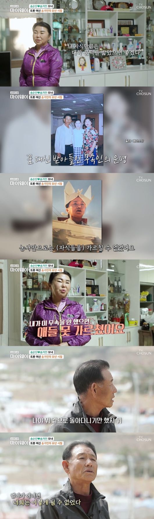 송가인은 엄마 송순단에 대해 "엄마가 열심히 살고자 하는 의지나 열정, 자식들을 위한 애착이 남들보다 더 강했던 것 같다. 어떻게든 열심히 잘 키워내려고 하는 의지 욕구가 강했던 것 같다"라고 했다.