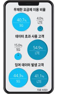 17일 국책연구기관인 정보통신정책연구원(KISDI)이 실시한 '통신 이용정보 사용자 조사'에 따르면 5G 가입자 중 44.3%는 요금제 데이터 제공량보다 실제 사용량(3개월 평균치)이 적은 것으로 나타났다. 제공량보다 더 많은 데이터를 사용한 경우는 15.0%에 불과했다. 무제한 요금제 이용 비율도 응답자의 40.7%에 달했다.