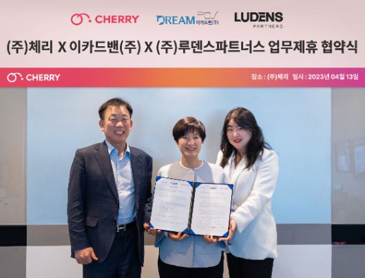 (사진 왼쪽부터)김중제 이카드밴 대표, 이수정 체리 대표, 성래현 루덴스파트너스 대표가 '기부 키오스크 개발' 관련 협약을 체결하고 기념 촬영 중이다/사진제공=체리 |