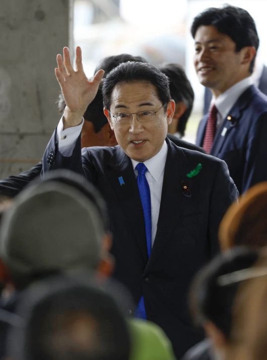 지난 15일 기시다 후미오 일본 총리가 일본 와카야마현에서 현지 보궐선거 지원 연설을 위해 나서며 인사하고 있다. (사진=연합뉴스) |