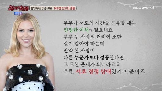 결국 스칼렛 요한슨과 라이언 레이놀즈는 2011년 이혼을 결심했다. 이어 정다희는 당시 두 사람은 이혼 사유에 대해 의견차이라고만 했는데 추후에 스칼렛 요한슨은 '한 사람이 다른 누군가보다 성공하면 그 또한 문제가 되더라. 우린 서로 경쟁상대였다'라고 인터뷰를 했다고 설명해 눈길을 끌었다.