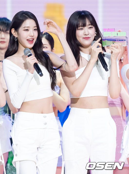 [OSEN=민경훈 기자] 18일 오후 서울 마포구 상암동 SBS프리즘타워에서 SBS M ‘THE SHOW(더쇼)’ 생방송이 진행됐다. 아이브(IVE)가 더쇼 1위를 한 후 기뻐하고 있다. 2023.04.18 / rumi@osen.co.kr