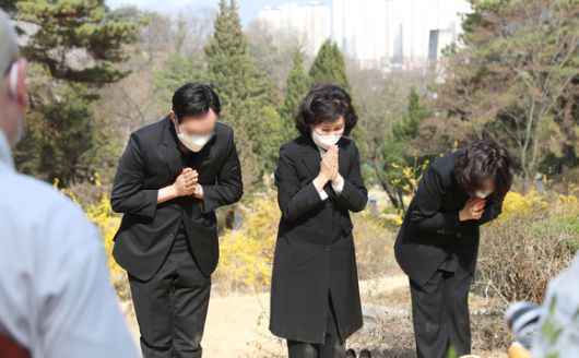 지난 1일 남양주 모란공원 민주열사묘역에서 고(故) 박원순 전 서울시장 묘소 이장 안장식이 부인 강난희(가운데) 여사 등 유족, 추모객들이 참석한 가운데 엄수되고 있다. [사진=뉴시스] |