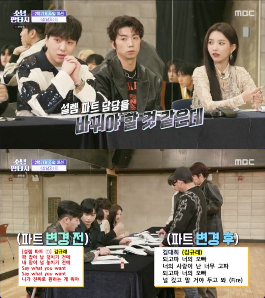 강승윤은 “파트를 이대로 가야하는 거예요? 설렘 바꿔야 할 것 같은데. 립싱크만 해야하는 수준이다”라며 날카롭게 지적했다. 결국 파트 재분배가 이어졌다. 리더로서 부담감을 보이는 황재민에게 우영은 따뜻한 조언을 전했다.