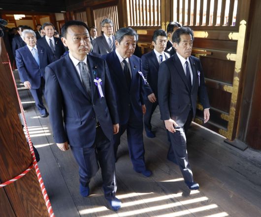 21일 오전 8시쯤 일본의 초당파 의원 모임인 ‘다함께 야스쿠니신사를 참배하는 국회의원의 모임’의 회원 87명이 도쿄에 있는 야스쿠니신사에 참배했다. 이 모임은 자민당, 일본유신회 등 야스쿠니참배에 찬성하는 의원들이 모인 의원연맹이다. 야스쿠니신사에는 제2차세계대전의 A급 전범 14명이 합사돼있다. 야스쿠니신사는 이날부터 이틀간 춘계 예대제(例大祭)를 하고 있다.