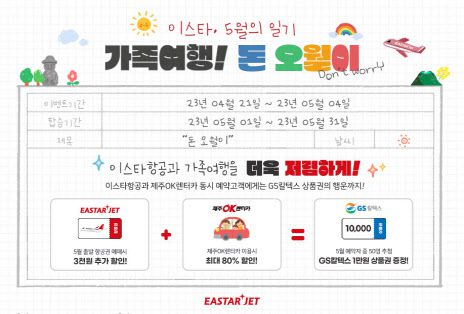 [이데일리 손의연 기자] 이스타항공이 5월 가정의 달을 맞아 21일 오후 2시부터 5월 4일까지 ‘가족여행! 돈 오월이’ 프로모션을 진행한다고 밝혔다.