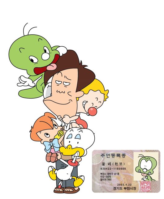 40년간 더부살이해 온 둘리 패밀리. 고길동 머리 꼭대기에 앉은 둘리부터 도우너, 희동이, 또치가 매달려있다. 오른쪽 아래 사진은 둘리에게 실제로 발급된 명예 주민등록증. /둘리나라 |