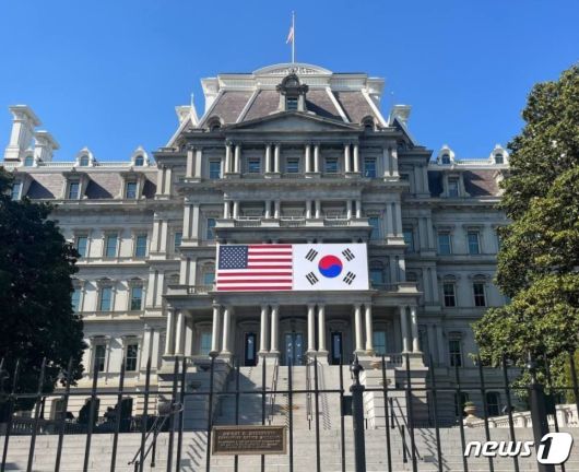 (서울=뉴스1) 정지형 기자 = 윤석열 대통령을 맞이하기 위해 미 백악관 옆 업무용 건물인 아이젠하워 행정동 빌딩에 21일(현지시간) 대형 태극기가 성조기와 나란히 내걸려 있다. 윤 대통령은 오는 24일부터 5박7일 일정으로 미국을 국빈 방문한다. (독자 제공)2023.4.22/뉴스1