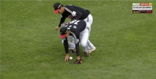 번트 타구를 서로 잡으려다 부딪히는 LG 정우영과 문보경. / MBC 스포츠플러스 중계 화면 |