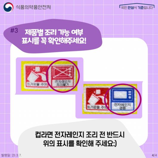 식약처 관계자는 “전자레인지 사용이 가능한 경우에도 별도의 예외사항이 적혀 있을 수 있으니 제품에 표시된 사용방법과 주의사항을 꼼꼼하게 살펴볼 필요가 있다”고 당부했다.