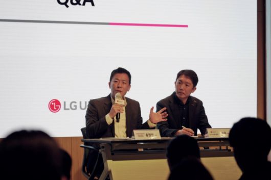 홍원빈 포항공대 교수(왼쪽)와 조제훈 LG유플러스 네트워크부문 엑세스선행기술개발팀장이 24일 서울 용산사옥에서 열린 기자간담회에서 RIS에 대해 설명하고 있다. /사진=LG유플러스 |