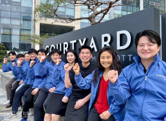 이지숙(오른쪽 두 번째) 코트야드 바이 메리어트 세종 총지배인이 내달 13일 오픈을 앞두고 구슬땀을 흘리는 직원들과 함께 호텔 앞에서 포즈를 취했다. 세종=정민승 기자 |