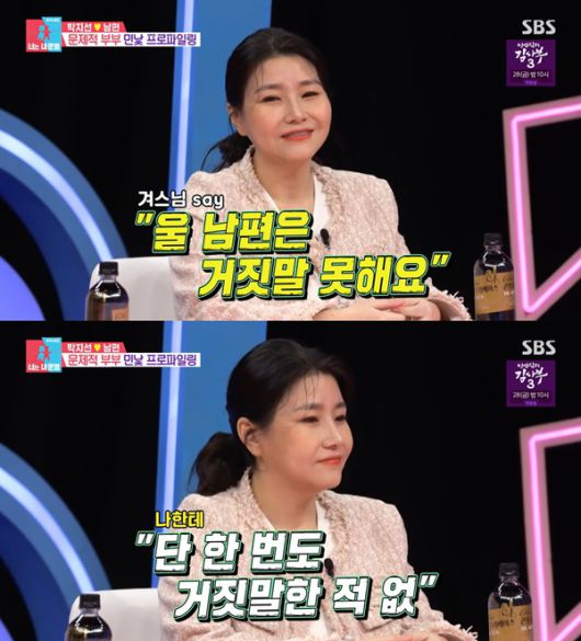 이날 MC 서장훈은 "박지선 교수의 남편이 거짓말을 못한다더라"며 "'나한테 단 한번도 거짓말을 한 적이 없다'고 호언장담했다"고 말했다.