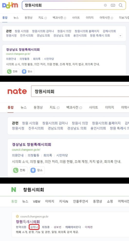 네이버에서 경남도내 다른 시·군 의회나 다른 광역단체의회를 검색하면 창원시의회 검색 결과와는 다르다.