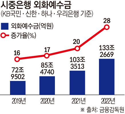 시중은행의 외화예수금은 연말 기준 △2019년 72조9502억원 △2020년 85조4740억원 △2021년 103조3513억원 △2022년 133조2669억원으로, 지난해의 경우 전년 대비 증가율이 28%를 기록했다.