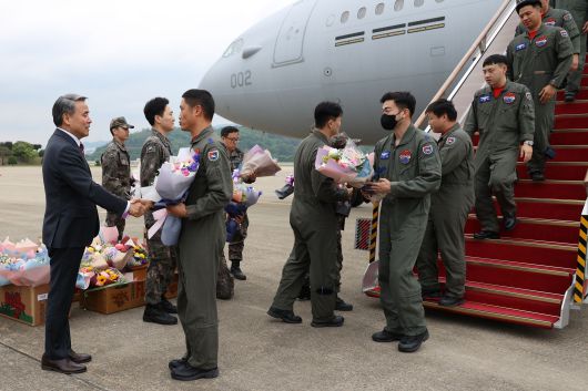 이종섭 국방부 장관(왼족)이 25일 경기 성남시 서울공항에서 수단 교민 구출을 위한 작전에 참가한 군인들을 격려하고 있다. /뉴스1 |
