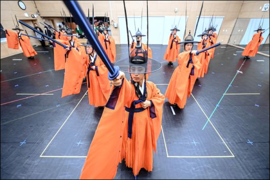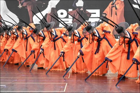 서울시무용단은 이날 남성 무용수들과 여성 무용수들이 각각 ‘정대업지무’와 ‘춘앵무’를 절도 있으면서도 아름다운 군무로 선보였다. 정대업지무는 종묘 제례 때 왕의 무공(武功)을 기리기 위해 무관들이 추는 검무(劍舞·칼춤)다. 특히 초연 때와 달리 남성 무용수들은 전통 의상에서 보기 힘든 주황색 옷을 입고 나와 눈길을 확 끌었다.