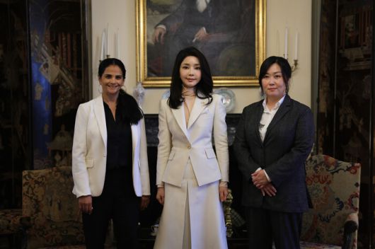 미국을 국빈 방문 중인 윤석열 대통령 부인 김건희 여사가 24일(현지시각) 워싱턴DC 블레어하우스에서 벨라 바자리아(왼쪽) 넷플릭스 최고콘텐츠책임자(CCO)를 접견한 뒤 김민영 넷플릭스 아시아태평양 콘텐츠 총괄 책임자(오른쪽)와 기념촬영을 하고 있다. 연합뉴스 |