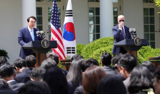 [워싱턴=뉴시스] 홍효식 기자 = 윤석열 대통령과 조 바이든 미국 대통령이 26일(현지시간) 워싱턴DC 백악관 로즈가든에서 공동기자회견을 하고 있다. 2023.04.27. |