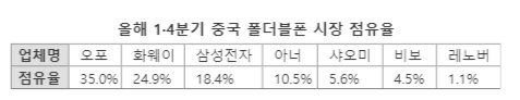 화웨이에 이어 오포가 올해 1·4분기에 중국 폴더블폰 시장에서 점유율 1위에 오른 가운데 삼성전자의 폴더블폰 시장 점유율은 갈수록 줄고 있다. 이에 따라 삼성전자가 갤럭시Z 시리즈 조기 출시에 나설 가능성이 높은 것으로 전망된다.
