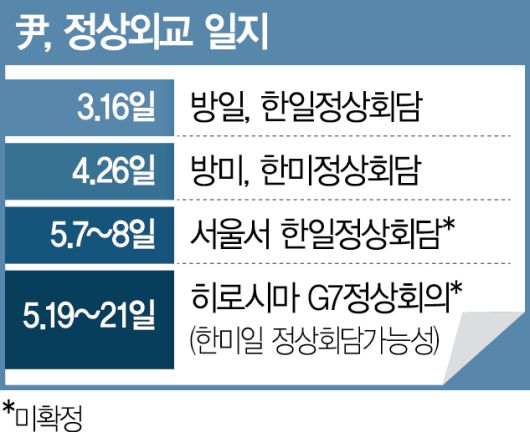 윤 대통령은 5월 초 한일정상회담 이후 같은 달 하순으로 예정된 주요 7개국(G7) 정상회의에도 참석할 예정이다. 3월 도쿄에서 열린 한일정상회담을 시작으로 불과 두 달여 만에 자유 진영 7대 선진국들과의 논스톱 정상외교 행보를 완성하게 되는 것이다. 이는 대한민국을 주요 8개국(G8)의 반열에 올려놓기 위한 ‘8강 외교 전략’의 일환으로 해석된다. 앞서 박진 외교부 장관은 국민의힘 의원 공부 모임인 ‘국민공감’에서 “대한민국은 G7과 어깨를 나란히 하는 세계 8강에 와 있다고 생각한다”고 강조하기도 했다.