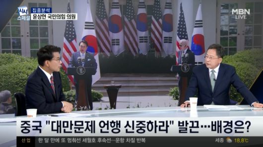 이번 한미 정상회담에서 대만 문제가 거론된 것을 두고 중국이 "위험한 길로 가지 마라"며 강하게 반발하는 것과 관련해 윤 의원은 "대만 해협 문제에 있어서는 무력에 의한 현상 변경은 절대 반대한다는 것이 윤석열 정부의 입장이다"며 "긴장 국면으로 가더라도 국가 이익의 원칙과 보편적 가치에 기반을 둔 외교를 하면 중국도 우리를 따라올 수밖에 없다"고 말했습니다.