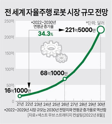 시장조사업체 넥스트 무브 스트래티지 컨설팅(Next Move Strategy Consulting)에 따르면 세계 자율주행 로봇 시장은 2021년 16억1000만 달러(약 2조원)로 추산된다. 2022년부터 2030년까지 연평균 34.3%씩 성장해 221억5000만 달러(약 30조원) 규모를 형성한다.