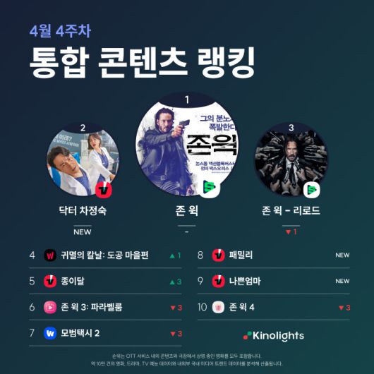 OTT 통합검색 및 추천 플랫폼 키노라이츠가 공개한 4월 4주 차 (4/22~4/28) 통합 콘텐츠 랭킹에서 <존 윅>이 3주 연속 1위를 차지하며 공고한 인기를 증명했다. 드라마 [닥터 차정숙]이 2위로 랭킹에 신규 진입했다.