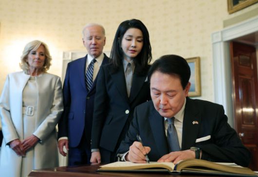 윤석열 대통령과 부인 김건희 여사가 25일(현지시간) 워싱턴DC 백악관 관저에서 열린 친교행사에서 조 바이든 미국 대통령, 질 바이든 여사와 함께 내부를 관람하던 중 블루룸에서 방명록을 작성하고 있다.(사진=연합뉴스) |