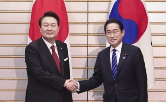 윤석열 대통령과 기시다 후미오 일본 총리가 지난 3월 16일 도쿄 총리 관저에서 열린 한일 확대정상회담에서 악수하고 있다. 도쿄=뉴시스 |