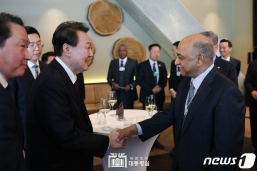 윤석열 대통령이 지난 1월18일(현지시간) 스위스 다보스의 한 호텔에서 글로벌 CEO들과의 오찬 간담회에 앞서 아르빈드 크리슈나(Arvind Krishna) 아이비엠(IBM) CEO와 악수하고 있다. /사진=뉴스1 |
