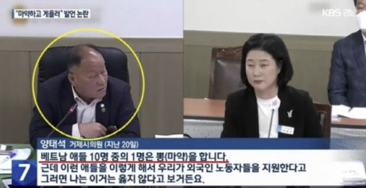 앞서 양 의원은 지난달 20일 거제시의회 상임위원회의에서 열린 ‘외국인노동자지원조례안’ 심의 과정에서 “베트남 애들, 이런 애들은 관리가 안 된다”, “베트남 애들 10명 중에 1명은 뽕을 한다. 지원하는 건 옳지 않다고 본다”, “걔들이 4~5명씩 모여 다니면서 침 뱉고 슬리퍼 끌고 시내 다니면 우리 관광 이미지는 어떻게 되겠나”, “베트남인은 게으르다” 등의 발언을 하며 조례 제정에 반대표를 던졌다.