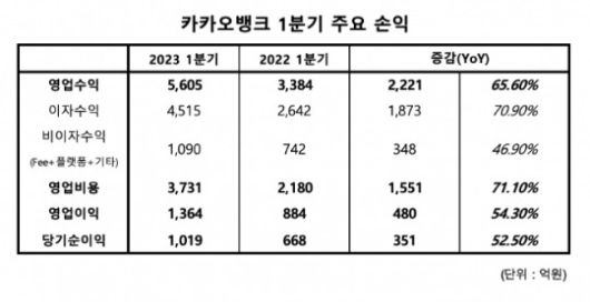 카카오뱅크는 1분기 당기순이익이 1019억원으로 집계됐다고 3일 밝혔다. 이는 전년 동기 대비 52.5% 증가한 수준으로 분기 기준 역대 최대 규모다.