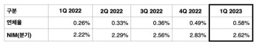 1분기 순이자마진(NIM)은 2.62%로 전 분기(2.83%) 대비 0.21%포인트 하락했다. 작년 1분기(2.22%)에 비해서는 0.40%포인트 상승했다.