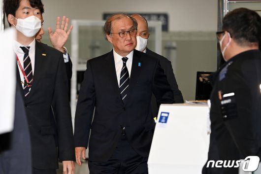 (서울=뉴스1) 이승배 기자 = 아키바 다케오 일본 국가안전보장국장이 3일 김포국제공항을 통해 입국해 차량으로 향하고 있다. 조태용 국가안보실장은 1박 2일 일정으로 방한하는 아키바 다케오 일본 국가안전보장국장과 한일 안보실장 회담 및 국가안전보장회의(NSC) 경제안보대화를 가질 예정이다. (공동취재) 2023.5.3/뉴스1