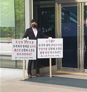 5.18유족회가 광주지방보훈청 앞에서 1인 시위를 하고 있다.[사진=유족회 제공] |