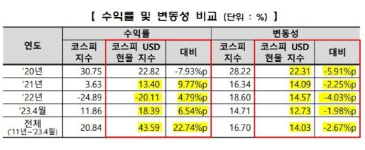 거래소에 따르면 2011년부터 올해 4월까지 코스피 지수가 20.8% 상승에 그친 반면 코스피 USD 현물 지수는 43.6% 상승했다.