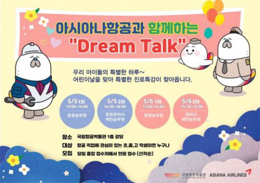이번 강연은 '아시아나항공과 함께하는 드림 토크(Dream Talk)를 주제로 5일과 6일에 각각 2차례씩 열린다. 각 차수에 126명 정원으로 초·중·고 학생 대상 선착순 현장 접수로 모집한다.