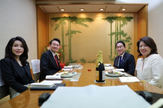 만찬 갖는 윤석열 대통령과 기시다 일본 총리 부부 - 1박2일간의 일정으로 일본을 방문한 윤석열 대통령과 김건희 여사가 기시다 후미오 일본 총리 부부와 16일 도쿄 긴자의 한 스키야키·샤부샤부 전문점에서 만찬을 하고 있다. 2023.3.16 연합뉴스 |